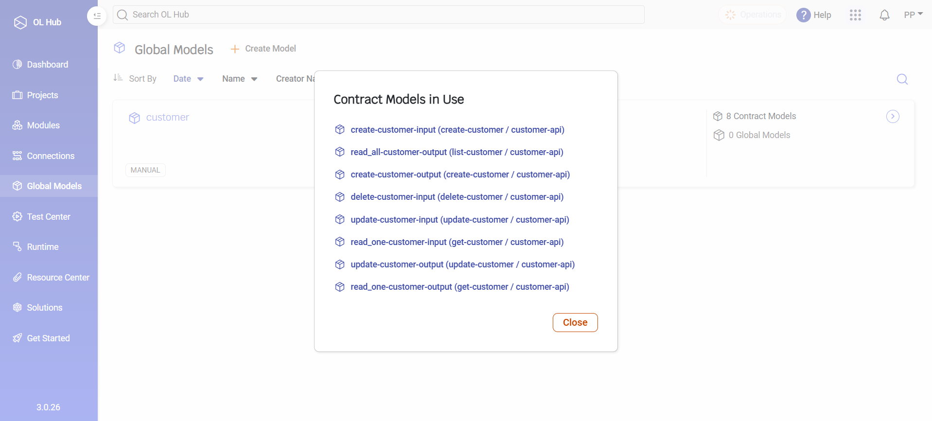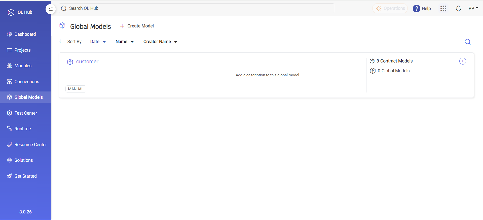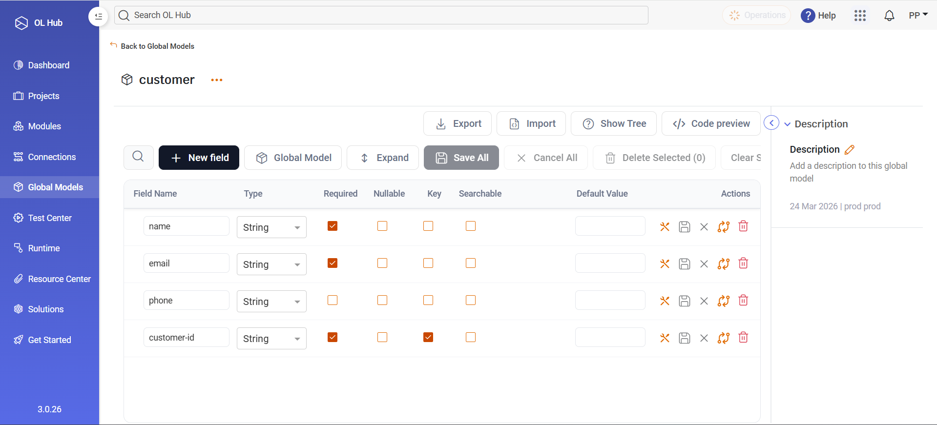 Global Models in OpenLegacy Hub are reusable, centrally managed data structures that you can attach to your Method Flows. They allow you to define business entities—such as Customer—once and reuse the same structure across multiple API methods.