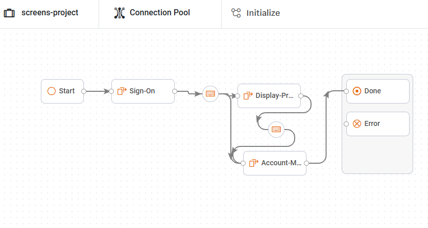 The Initialize flow establishes each terminal session and executes predefined navigation logic to reach a specific “ready” screen. The connection remains on this predetermined screen, waiting for incoming operations. This ensures that every pooled session starts from a known and stable state, ready for immediate use.
